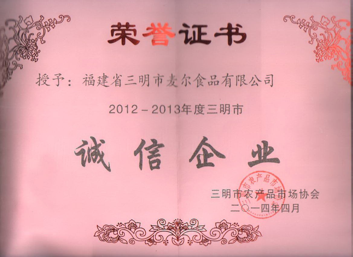 2014年9月12日,從三明市農(nóng)產(chǎn)品市場(chǎng)協(xié)會(huì)得知,公司被授予“2012~2013年度誠(chéng)信企業(yè)”稱(chēng)號(hào)。